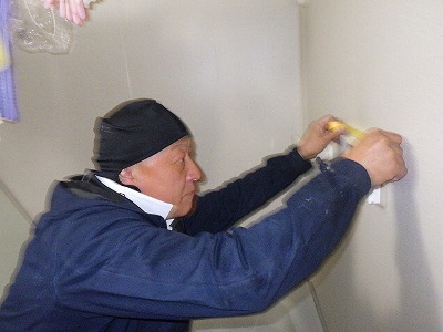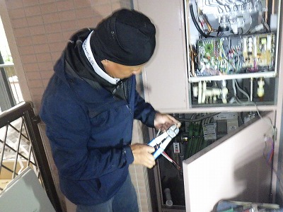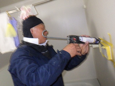 浴室リモコンの周りに防水のコーキングを打ちます