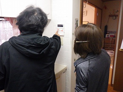 お客様に浴室リモコンの使い方の説明中です