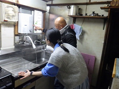 お客様と一緒に水漏れ・ガス漏れ確認をしています