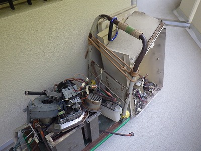 給湯器と給湯器を止めている枠が逆に付いているので、給湯器本体の中身を解体します