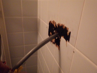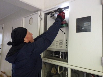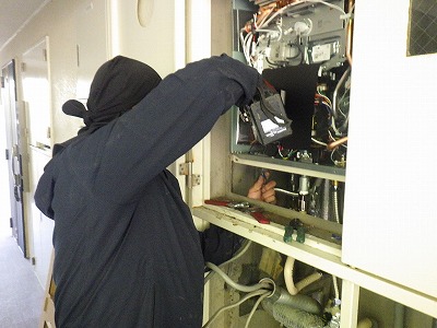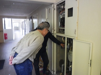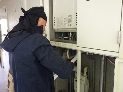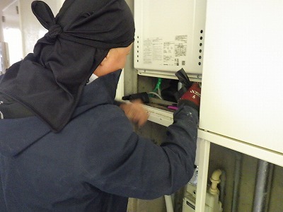 既存のノーリツ給湯器をパイプスペースより取り外します