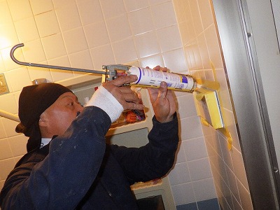 浴室リモコンのまわりに防水のコーキングを打ちます