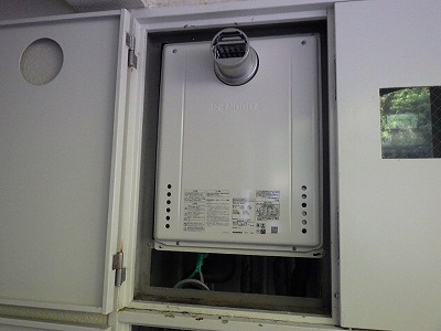 新しいノーリツ前方排気給湯器をパイプスペースに設置します