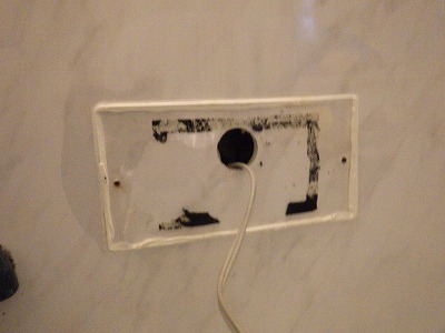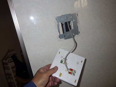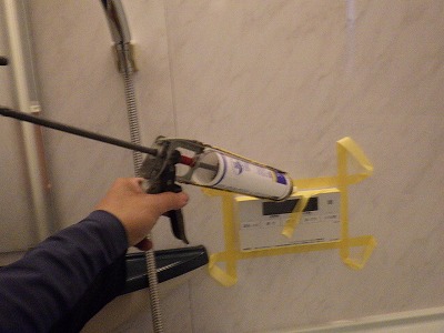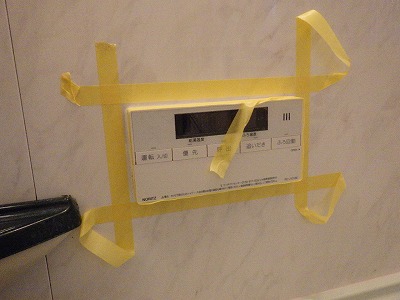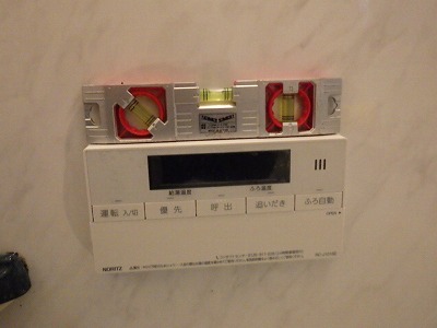 浴室リモコンの水平を確認しながら壁に取り付けます