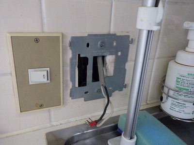 新しい浴室リモコンの水平を確認しながら壁に取り付けます